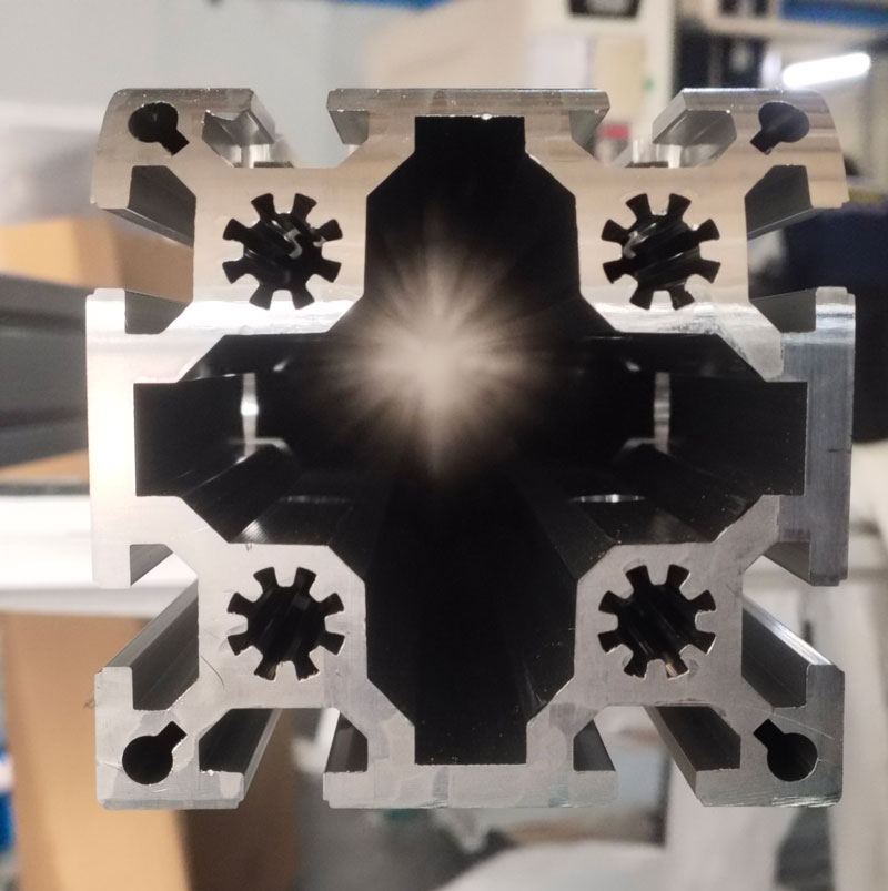 今天給大家介紹大規(guī)格的工業(yè)鋁型材,它就是歐標(biāo)100乘100鋁型材,利用鋁合金加工性能優(yōu)良的特點(diǎn),使用模具將圓柱形鋁錠擠壓加工而成。其截面尺寸是100mm乘100mm,整支長(zhǎng)度是6.02米,可以根據(jù)需求進(jìn)行切割。